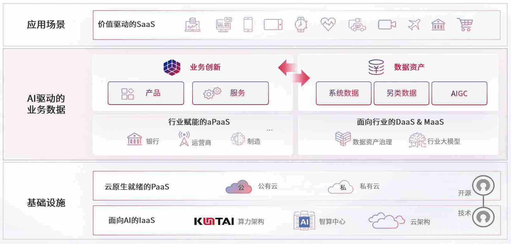 数字时代,,围绕企业数字化转型的关键要素,,,z6com尊龙凯时数码开创性的提出数云融合战略和技术体系框架,,,,着力在云原生、、数字原生、、、AI原生和信创产业上架构产品和服务能力,,为处在不同数字化转型阶段的快消零售、、、汽车、、、、金融、、医疗、、、政企、、教育、、运营商等行业客户提供泛在的敏捷IT能力和融合的数据驱动能力,,构建跨界融合创新的数字业务场景和新业务模式,,助力企业级客户建立面向未来的核心能力和竞争优势,,,全面推动社会的数字化、、智能化转型升级。。。